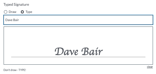 - Allowing users to type signatures when drawing is clunky or prone to errors